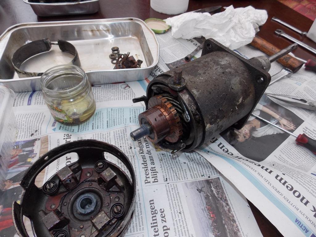 Most of the "original" starters I have been into are full of oil and grime. Doesn't take much wear on the shaft bushings or clogging of the weep hole in the nose cone to allow oil to migrate into the starter itself. Just as a matter of routine maintenance, I always take an unknown starter apart, clean it up, install new brushes, replace the rear bushing with a sealed ball bearing, and install the kit with the seal in the nose cone. I also make the 45 mile trip to take the armature to a small town automotive electrical shop (none closer) to have the armature tested on a growler and the commutator turned. Its a good investment for $20. I try to live by that motto: "Do it once, do it right, and you don't have to do it again".