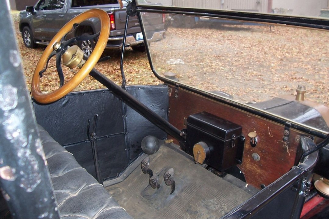 The seat conversion is somewhat common for that period of time. I have a 1914 touring in similar condition, but no folding seat I wish to sell. I have the original upholstery too, but some former owner scraped the paint from the wheels.