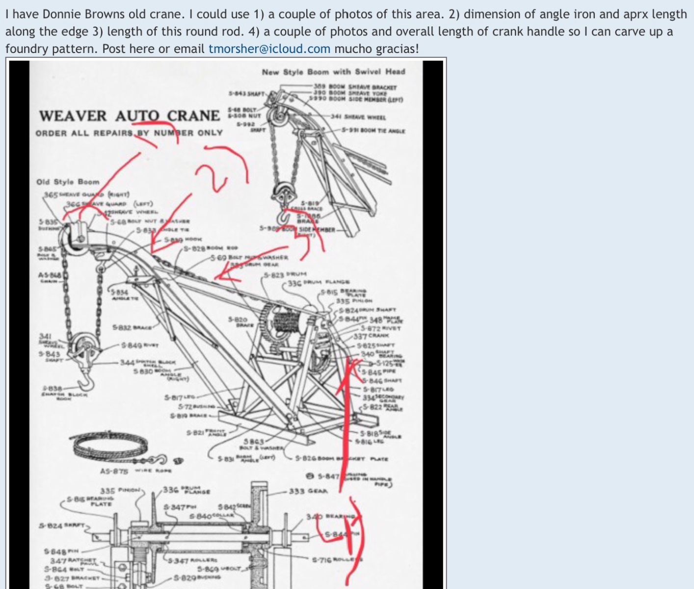 I have Donnie Browns old crane. I could use 1) a couple of photos of this area. 2) dimension of angle iron and aprx length along the edge 3) length of this round rod. 4) a couple of photos and overall length of crank handle so I can carve up a foundry pattern. Post here or email tmorsher@icloud.com mucho gracias!