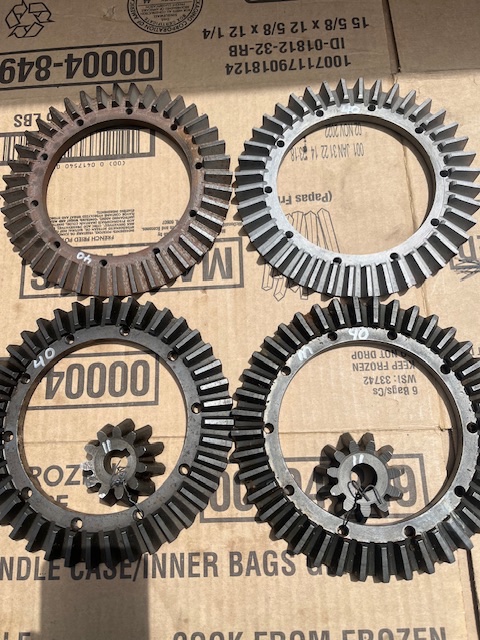 2 sets of ring and pinion gears, the lower right is mark auto brand, the on set of the left is un marked. $375.00 per set. The 2 ring gears on the top are un marked, $300.00. All plus shipping. Kdmks@att.net.