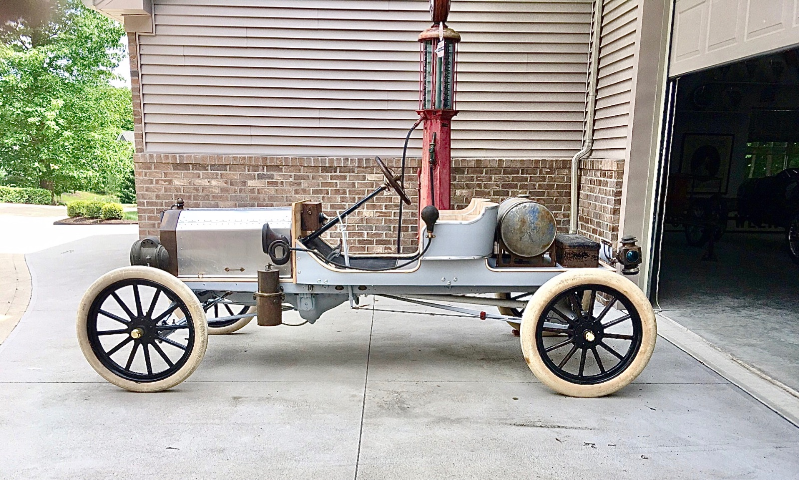 First time on the ground so I pushed it outside to have a look. I’m happy. With a 2 1/2” dropped axle and 26/27 spindles, I had to really flatten out the rear spring to get the car to sit level.