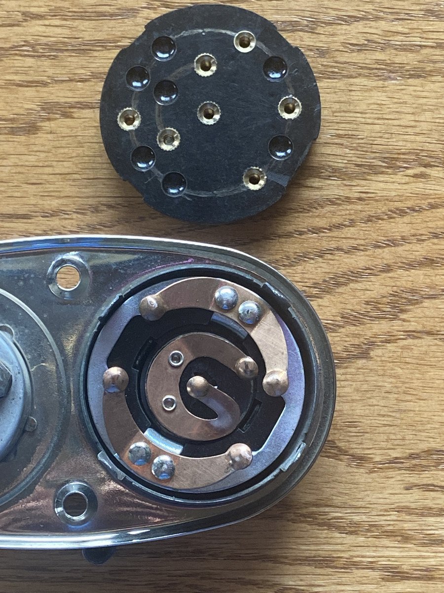 On the contact layout in the switch, the bright brass contact joins the dim contact to the battery contact from 11 to 3 o'clock, while the bright contact joins the bright contact to the battery contact from 7 to 3 o'clock. They are significantly separated from each other, and since the contacts fit into brass recesses, there should be no allowance for overshooting a connection, so I can't see why there is this overlapping switch effect. There is a trace of a metallic trail between the recesses, but it's broken with divots that eliminate any continuity.