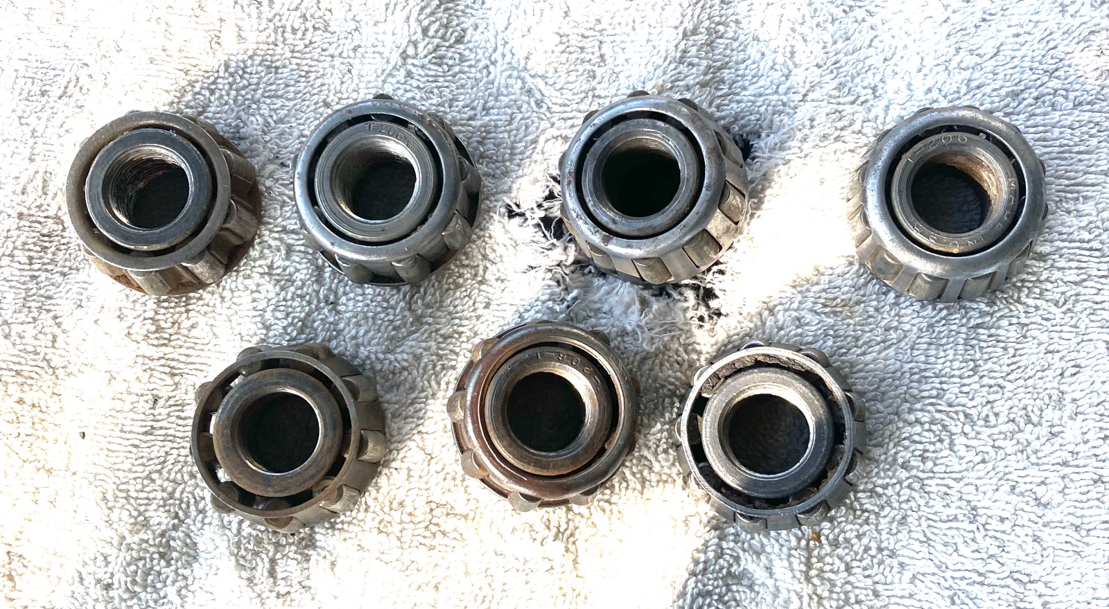Used. Superficial rust while on the shelf. Washed in gasoline. No bench wire brush or sandblast. Upper left, lower left and lower right Timkin 09075. Rest no markings.