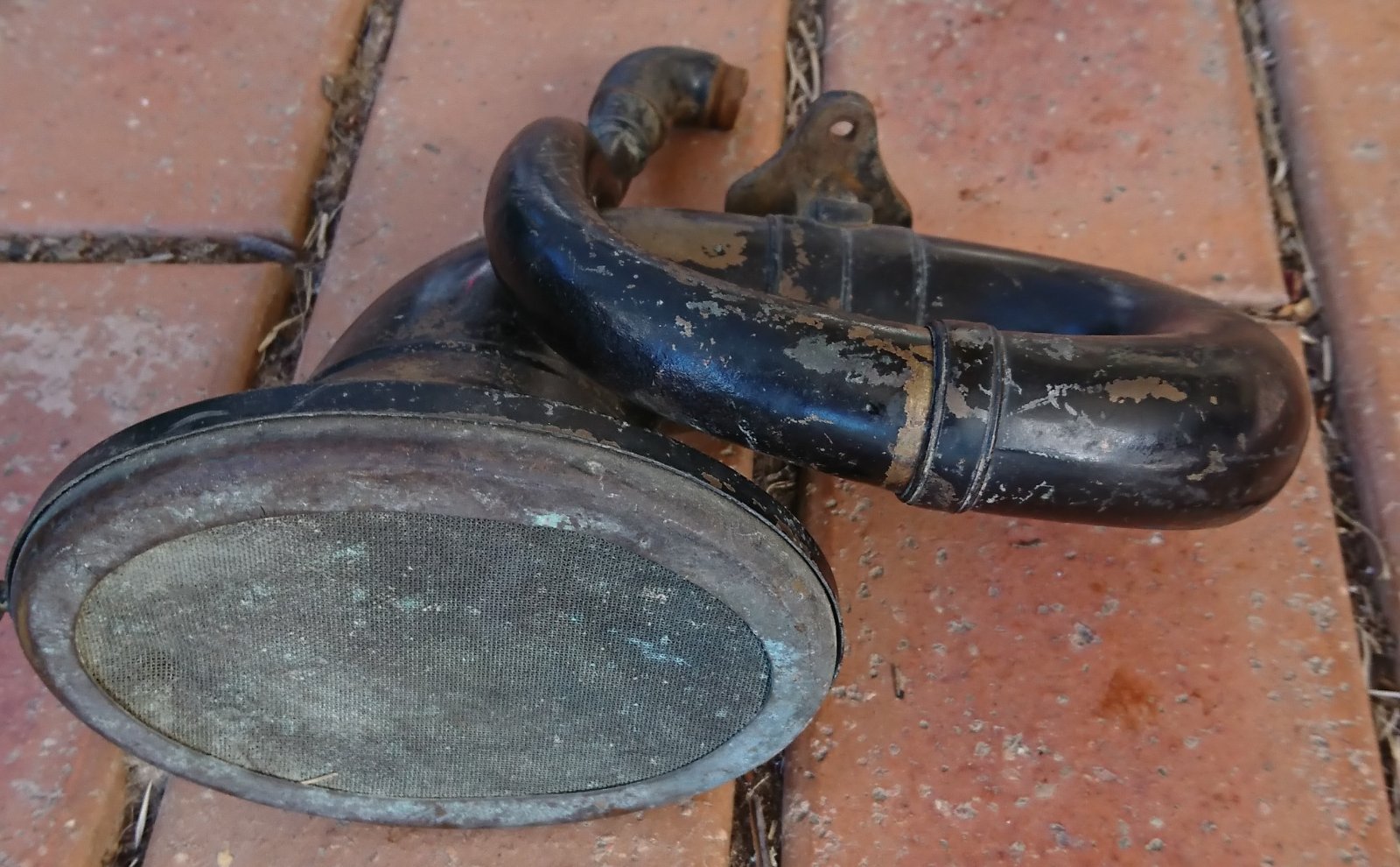 A Rubes horn in very nice unrestored condition. This has the diamond shaped mounting bracket which is specific to 1915. It also has the extremely hard to find 90 degree elbow which was used in early 1915 only. The horn has a few minor dents which would be easy to fix. One thumb screw for the rim is missing, and the small tube is loose where it attaches to the main body of the horn (just needs resoldering). Overall its a really nice horn. USD $285 includes air mail postage from Australia with tracking. Payment by Paypal.