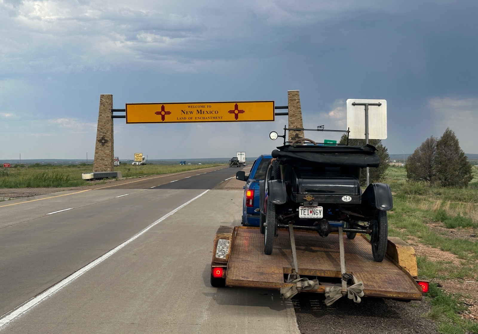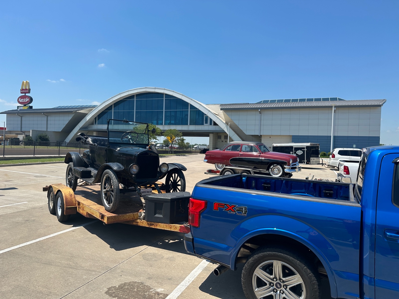 It is almost 1900 miles for us to go. Stopped in Oklahoma and met someone trailering a ‘51 Crestline to his nieces wedding in Fort Worth.