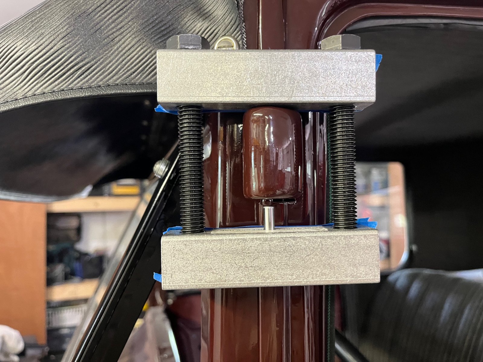 Bruce, I had the same problem when installing those mirrors on my Tudor. To save miss strikes and paint damage I used a centre punch to mark the underside of the pin and drilled a shallow depression . Then I used the same centre punch in that depression and drove the pin out from there. The depression helps to stop the punch migrating.
