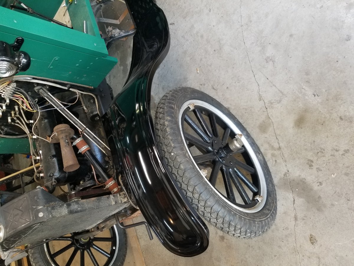 Thanks guys. Wayne I am being good. I spent today knockin tin. The one front fender looked like somebody parked their T on it. Welded cracks and brackets and have them primed. Test fitting this evening. I need to adjust one fendrr brace about 3/8 in.
