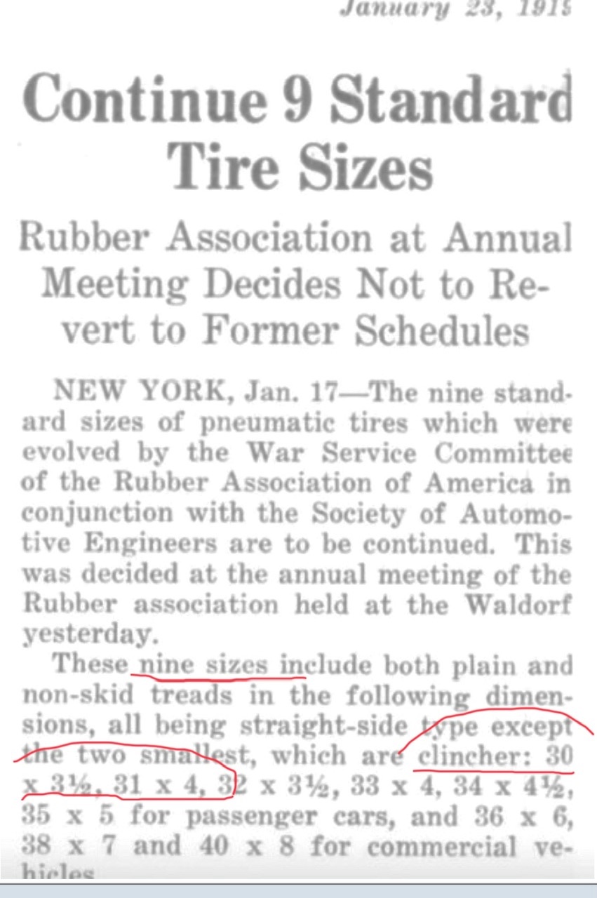 The tire industry consolidated tire sizes and the clincher tires sizes were back then 30x3, 30x31/2 and 31x4.kmatt2 wrote: ↑Fri Jul 26, 2024 7:53 pmA note about the 30 “ X 3 1/2 “ tire size. Some time after the USA entered WW I in April 1917 the tire size 30” X 3 1/2 “ Oversize became the standard to bridge the 30” and 32” tire sizes with just one tire. This is why the inflated 30 “ X 3 1/2 “ tire ( oversize ) now measures around 31 1/2 inch’s diameter.