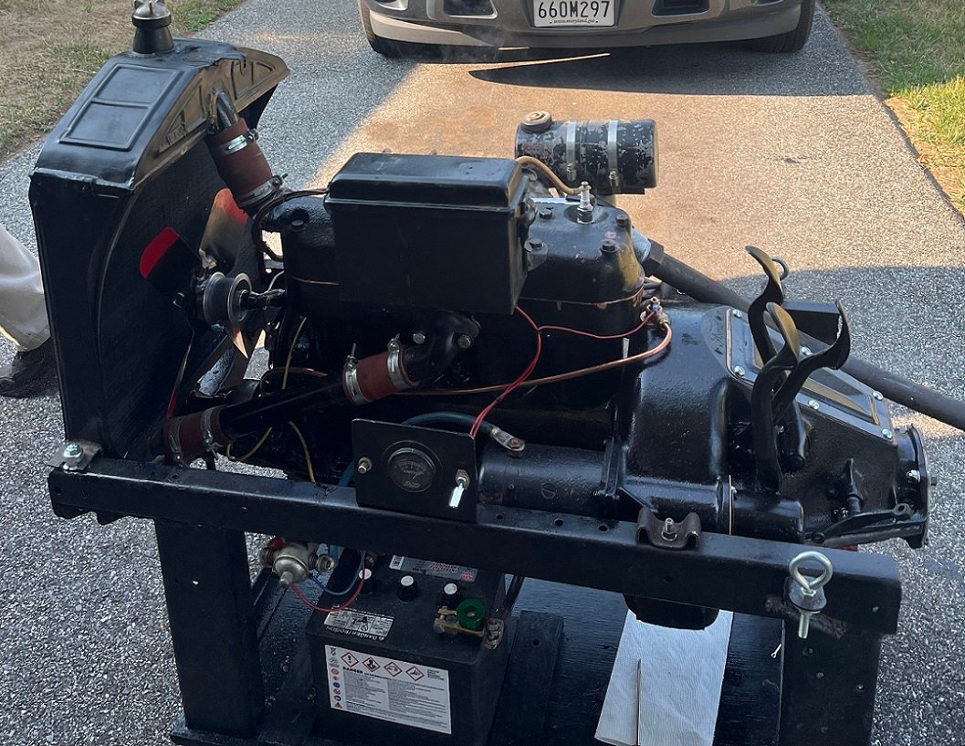 A complete very low milage 1925 engine, factory stamped with an early February 1925 Build Date and stored for many years. The head was removed and allowed an inspection of the block that showed eight original valves with the two dimples in the top, four original pistons with no wear ridge at the top of the cylinders. An improved head was installed, with a new copper head gasket and most other gaskets were replaced during the inspection process. The transmission lacked a few parts, but has three new demountable bands with new Kevlar linings. A working starter and generator were added, along with a New Old Stock exhaust manifold, a Russ Potter rebuilt carburetor, and a remanufactured 4th Main Bearing. The water pump was not required and the proper inlet and outlet connection was attached. While the test stand is only configured to run an engine in high gear, the pedals were pushed to check their control. The engine started easily and ran great! A short video was produced that can be sent to hear it run. The cost is $2,500 and the engine cannot be shipped.