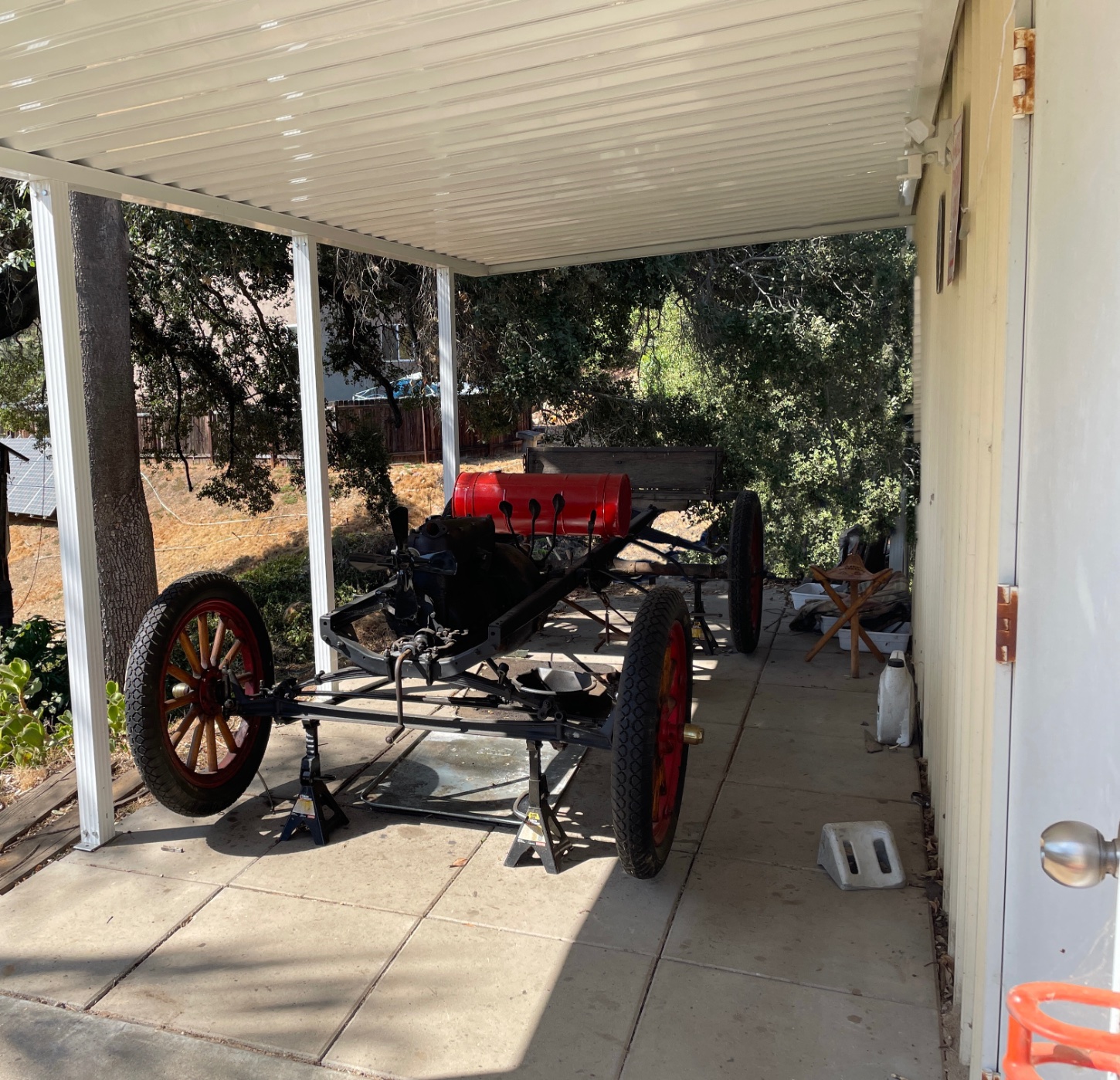 I layed some pavers and built a patio cover then started my 1913 restoration. The box in the photo was there for two days max before giving the contents-fenders and running boards- to a club member. Apparently the insurance company thinks I’m a hoarder; probably never built a 1913 Ford Model T Roadster.