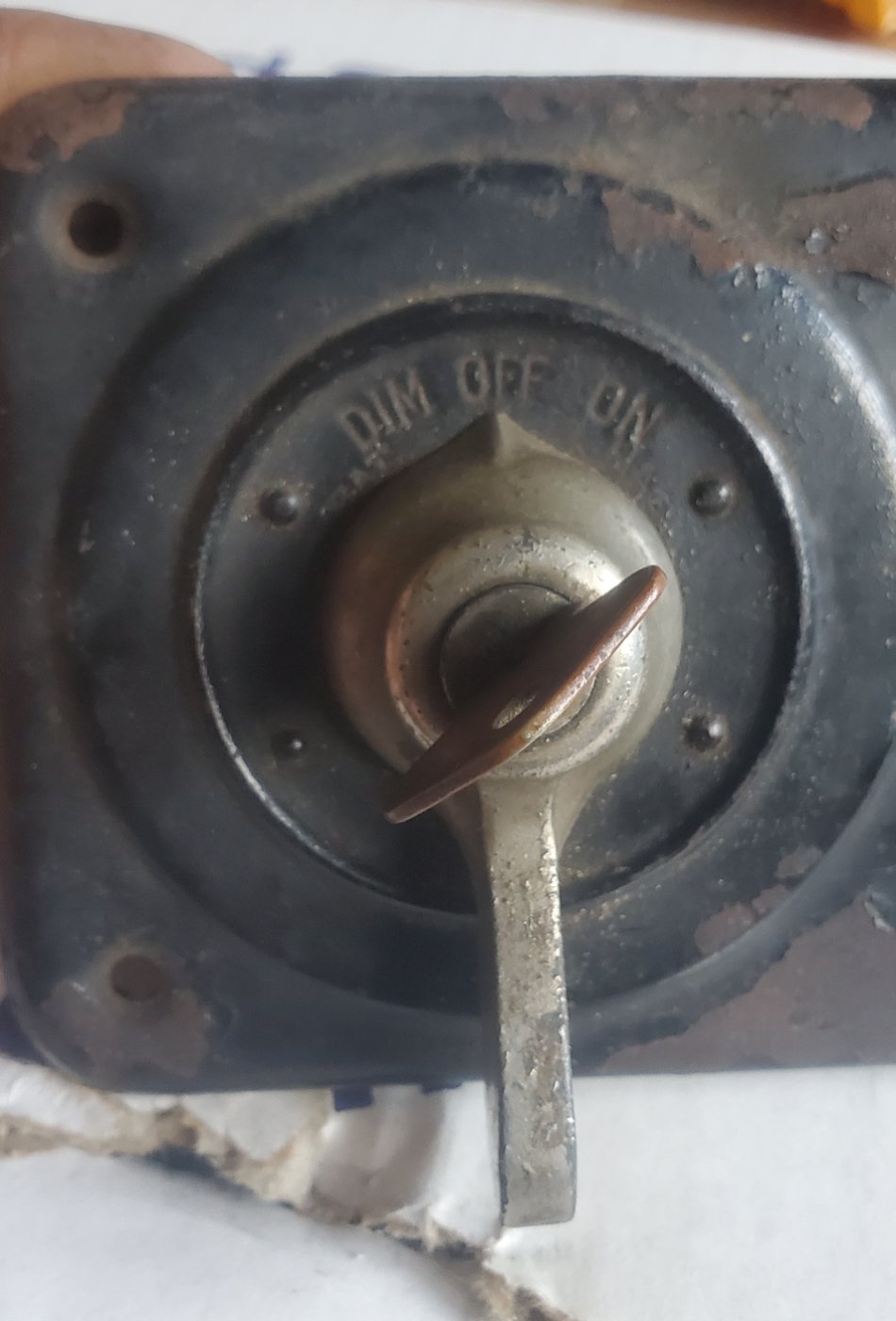 Sold ignition switch feels good along with the light switch cast style light switch lever. I'm unsure if the amp gauge works the needle moves free and is in good shape the housing is cracked see pics. Key is #55. 100$ shipped lower 48