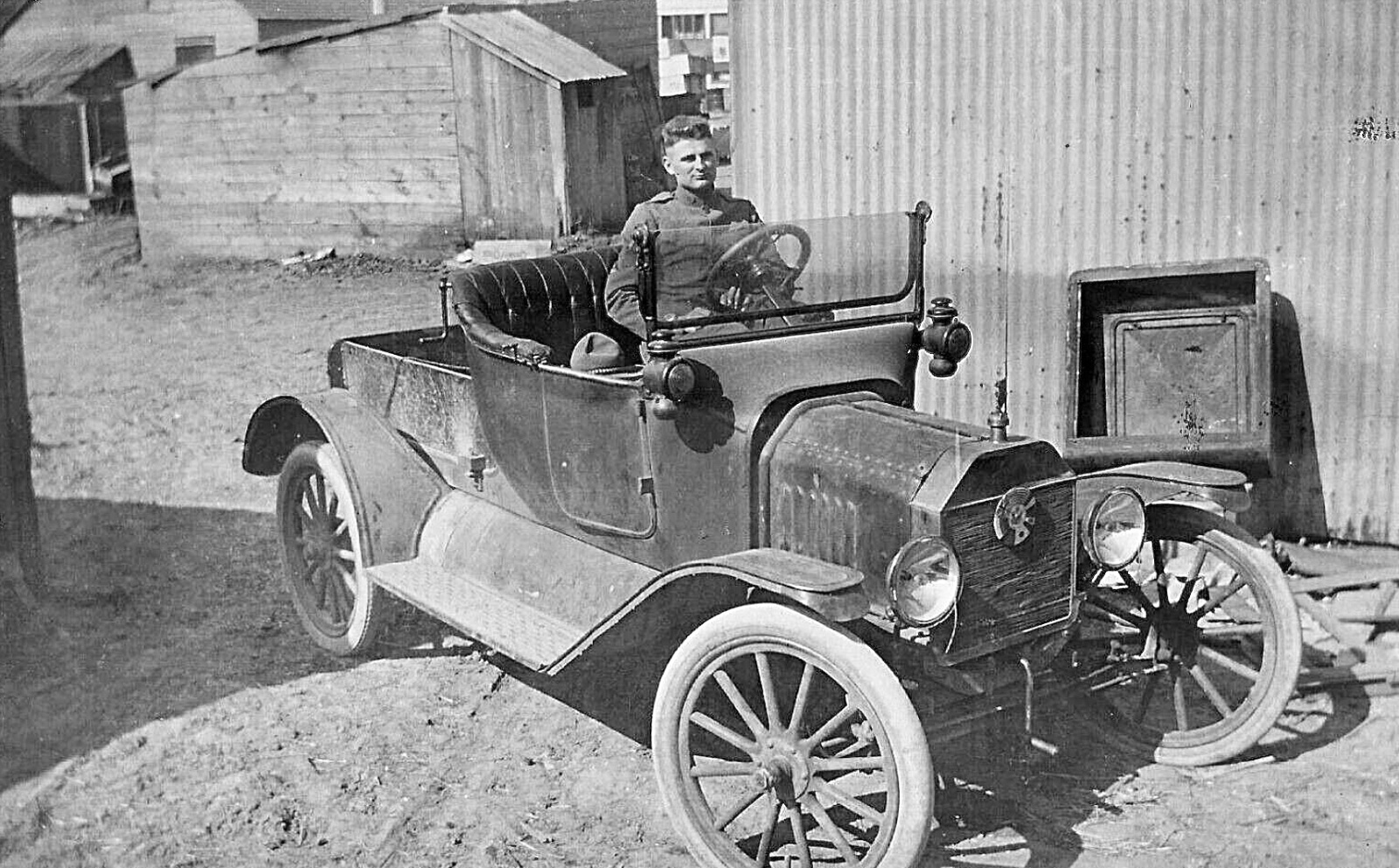 Number three, a 1915/'16 runabout, with a small pickup box on the back. It is a bit beat, both headlamp lenses and rims are missing. Notice the old turtle deck leaning against the tin shed!
