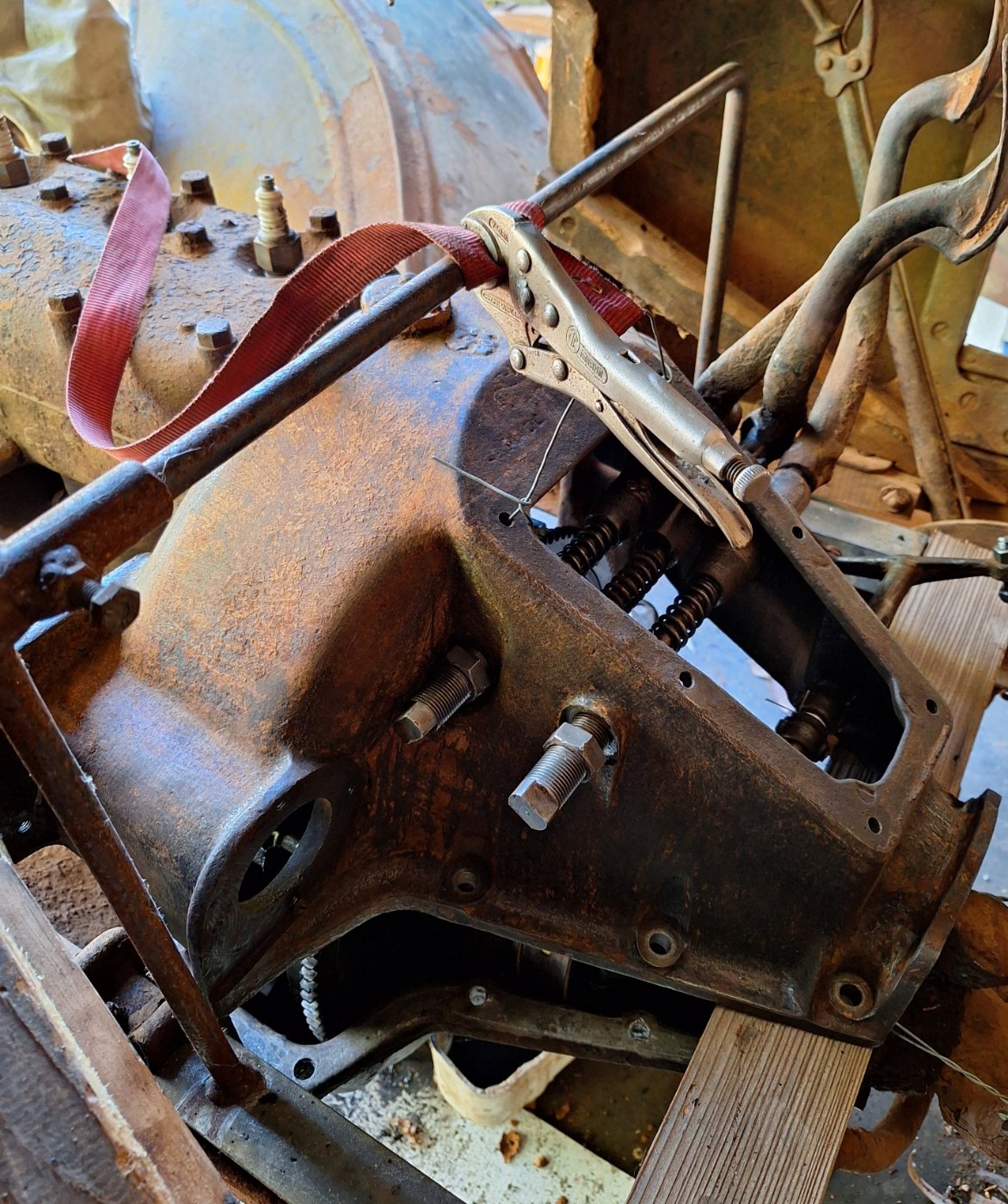 John, they are there to allow the cover to be lowered in stages, without me having to support the weight of the cover. Once the pedal rods are lowered to contact the ears, the vice grip holds the cover in place while I manipulate the springs and ears on the pedal shafts. Then it can be dropped a little more, and the ties on the bands removed before lowering it right down.