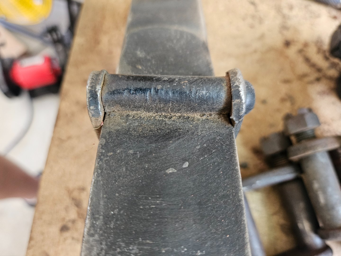 The spring perch bolt itself is not significantly worn one side to the other, but the arm itself is slightly ovaled out. The spring perch was drilled out to enable oiling. That would have to remain if I kept the shocks on the car, but I would fill if I removed them.