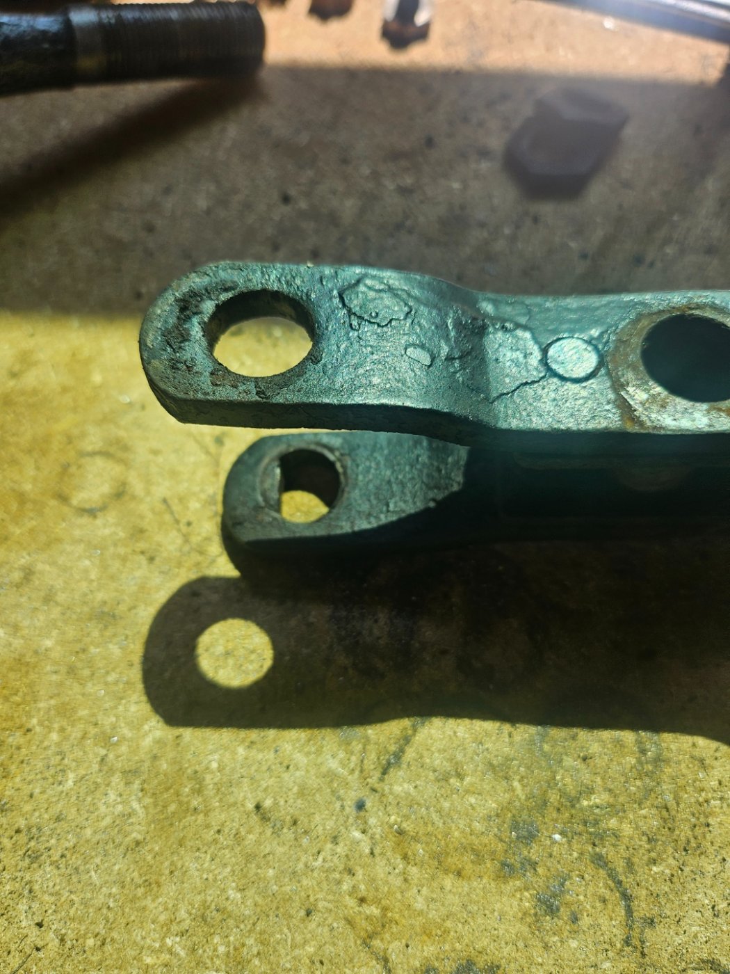 I haven't touched the rear axle yet, but removing/rebuilding the rear shocks will require getting some stock rear perches...the shock system replaced the rear perches, while using/reversing the fronts. In the pic you can see the flat perch style. This part also has some cast markings, only part of the shocks with any kind of marking... still can't make them out though. But, while not yet investigated, one side is disconcerting, reviewing the pics I take of everything, I don't know yet if it's a scratch, casting indent, or a really bad crack seen left of the bolt head.