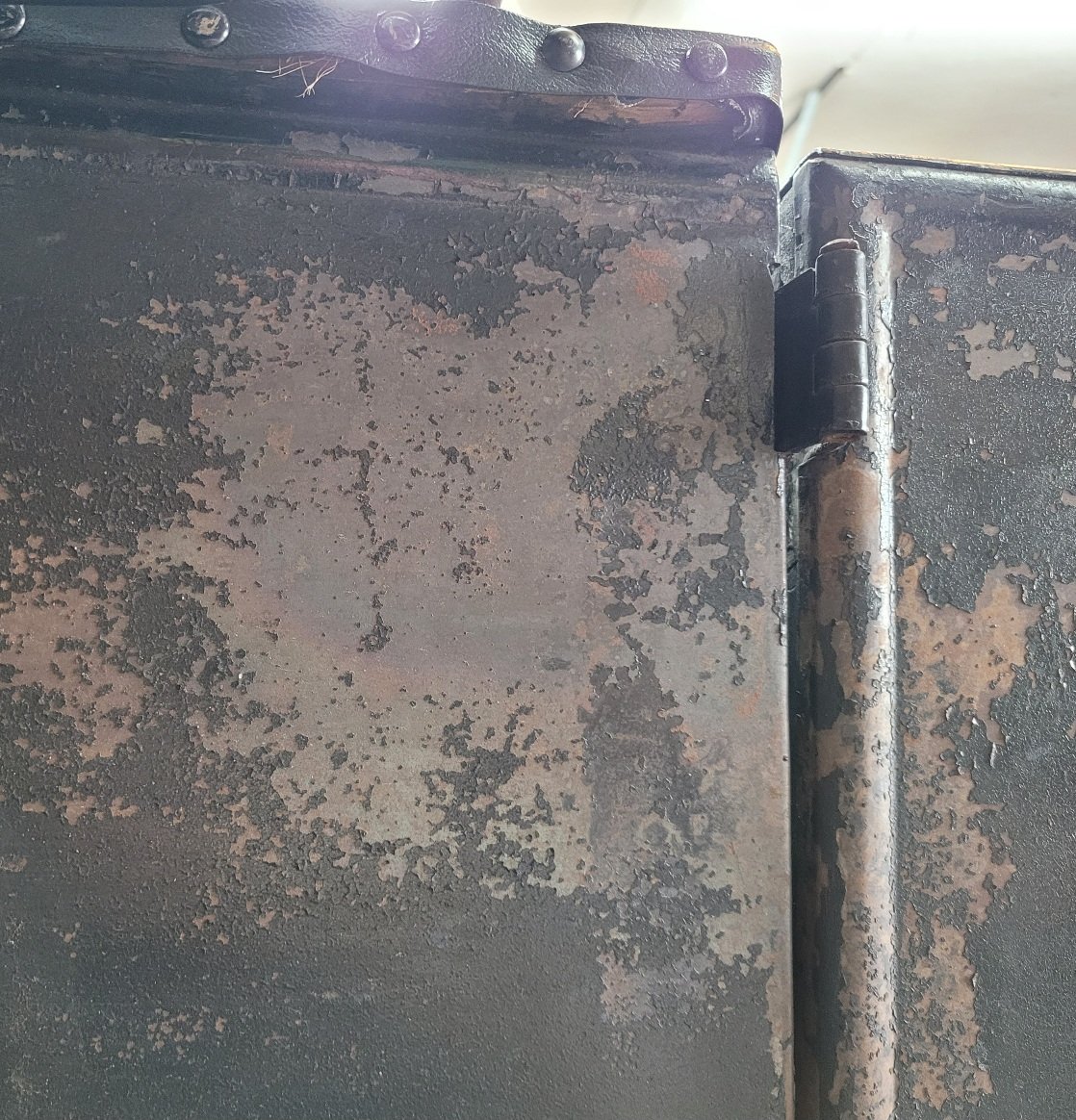 Let's stay with the black/blue hue for a moment. in 1913 what would the blue portion of the pigment be? Because of things going on in Prussia at the time...Prussian Blue powder was costing about 4-5 times per pound than other pigments. This led to trying all kinds of other pigment substitutes to make things 'bluish' in hue/haze. Some of those had a knack for self-oxidizing under the varnish coats. And...if they were natural mineral pigments what color does this oxidation take on? YELLOW. Yellow and Blue make... This could and I repeat could make the ground coat have a greenish cast to it. That's one!