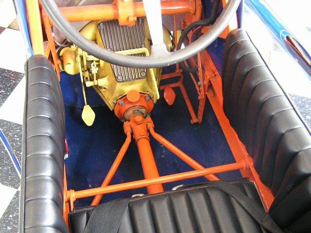 Most of the one man cars used a worm gear steering box mounted above the hogs head, aligning the steering wheel to the center of the chassis. From there, the “side steer” drag link can be coupled to Model A steering arms mounted in T spindles. This is the only pic I have at the moment where you can see the bracket on the frame to support the extended length pitman arm shaft and Model A type drag link (presumably tie rod too)