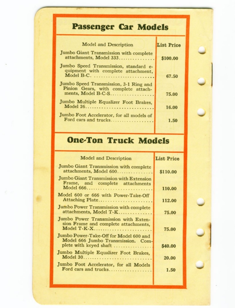 Decent auxiliary transmission. I don’t know the fill level for a Jumbo but with a Muncie or original Warford about 1/3 of the case with 85-140 is what I’ve seen. I’ve also seen the results of over filling sloshing out of the relief orifice. I’d encourage you to use a climbing oil product in addition. “ In 1923 the Price-Hollister company in Illinois began building the Jumbo transmission. Like the Muncie, this was a selective sliding gear transmission and in conjunction with the Model T Ford transmission, also produced 7 forward speeds and five reverse. Transmissions were provided for both the car and truck market, but in 1924, the company began producing the Jumbo Giant. This was basically a "beefed" up version of the Jumbo transmission, specifically built for the truck owner.” Attached is information you may need for you friend courtesy of Frank Brandi