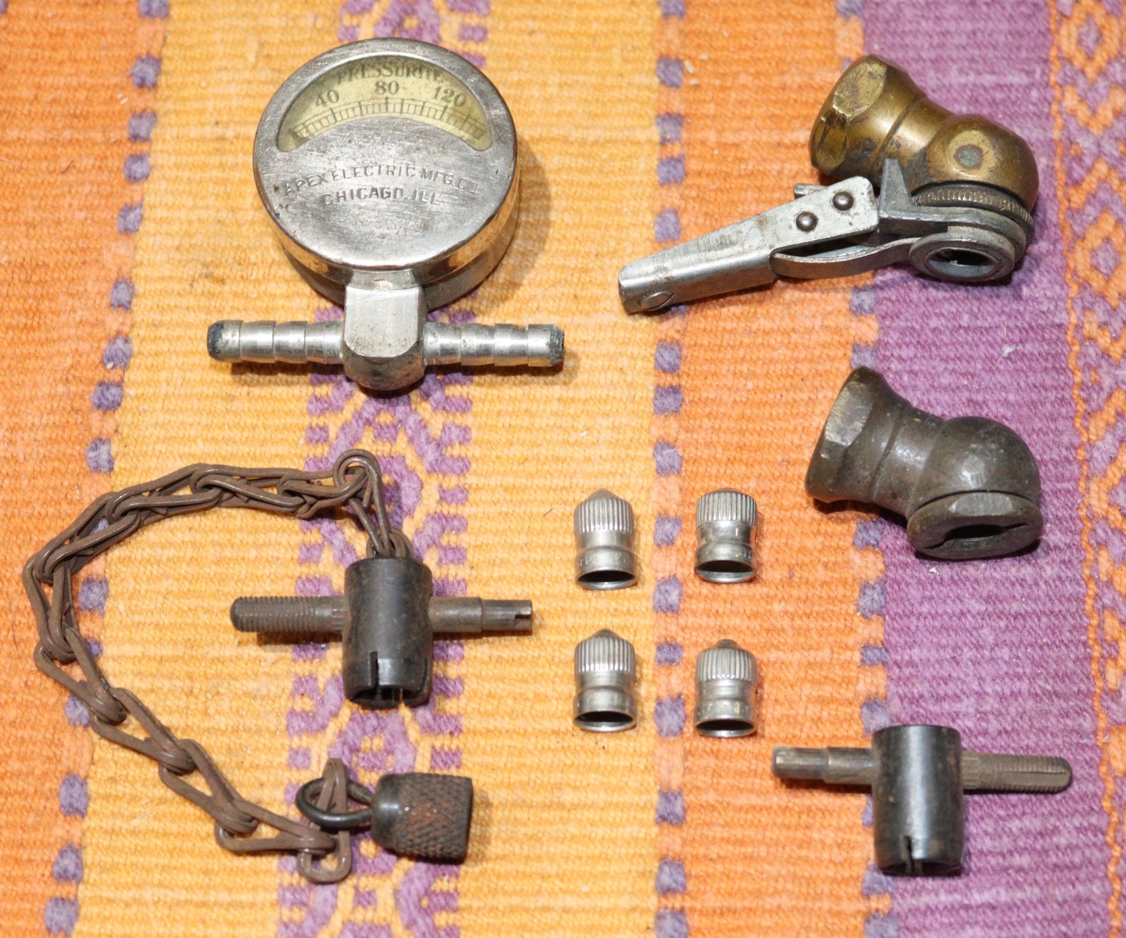 Kellogg in line tire pump gauge, Schrader tire pump filler ends one with lock and one without, Tire tube stem 4 in one and three in one tools, and four metal valve stem caps. Asking $30 for the lot plus postage.