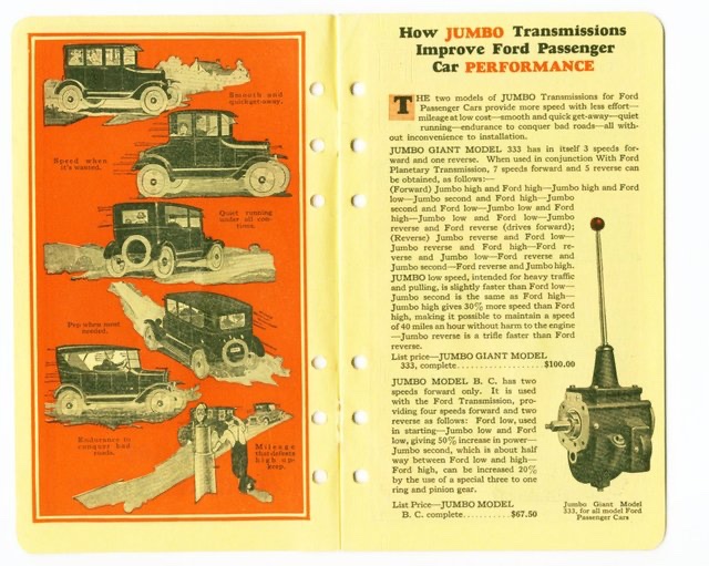 Decent auxiliary transmission. I don’t know the fill level for a Jumbo but with a Muncie or original Warford about 1/3 of the case with 85-140 is what I’ve seen. I’ve also seen the results of over filling sloshing out of the relief orifice. I’d encourage you to use a climbing oil product in addition. “ In 1923 the Price-Hollister company in Illinois began building the Jumbo transmission. Like the Muncie, this was a selective sliding gear transmission and in conjunction with the Model T Ford transmission, also produced 7 forward speeds and five reverse. Transmissions were provided for both the car and truck market, but in 1924, the company began producing the Jumbo Giant. This was basically a "beefed" up version of the Jumbo transmission, specifically built for the truck owner.” Attached is information you may need for you friend courtesy of Frank Brandi