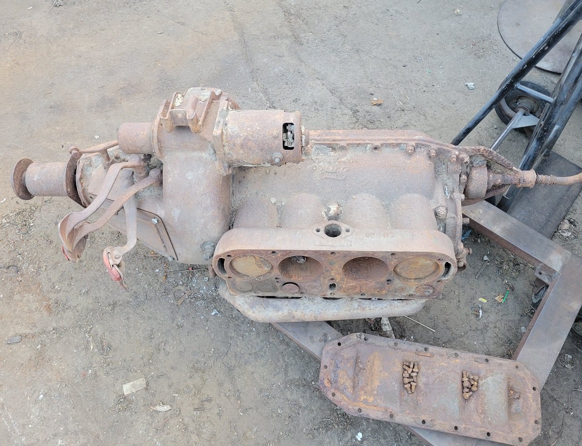 FS: A 24-25 T Engine that was converted to a stationary application and later found on a farm in Oxnard, CA. The bottom end looks about average, although it looks like the shims have mostly been taken up. The pistons are stuck, and the valves are 2-piece. The block looks pretty good, however. The 4-dip pan is rotted in various places, as this engine was left lying in the dirt for the last 70 or so years. The starter and generator are still attached. The head (later style) is off but it will be included. I haven't had a chance to really look at the tranny drums. There's enough here to rebuild, I think, as it's not a complete pile of rust. Asking $100; you pick up in El Monte, CA.