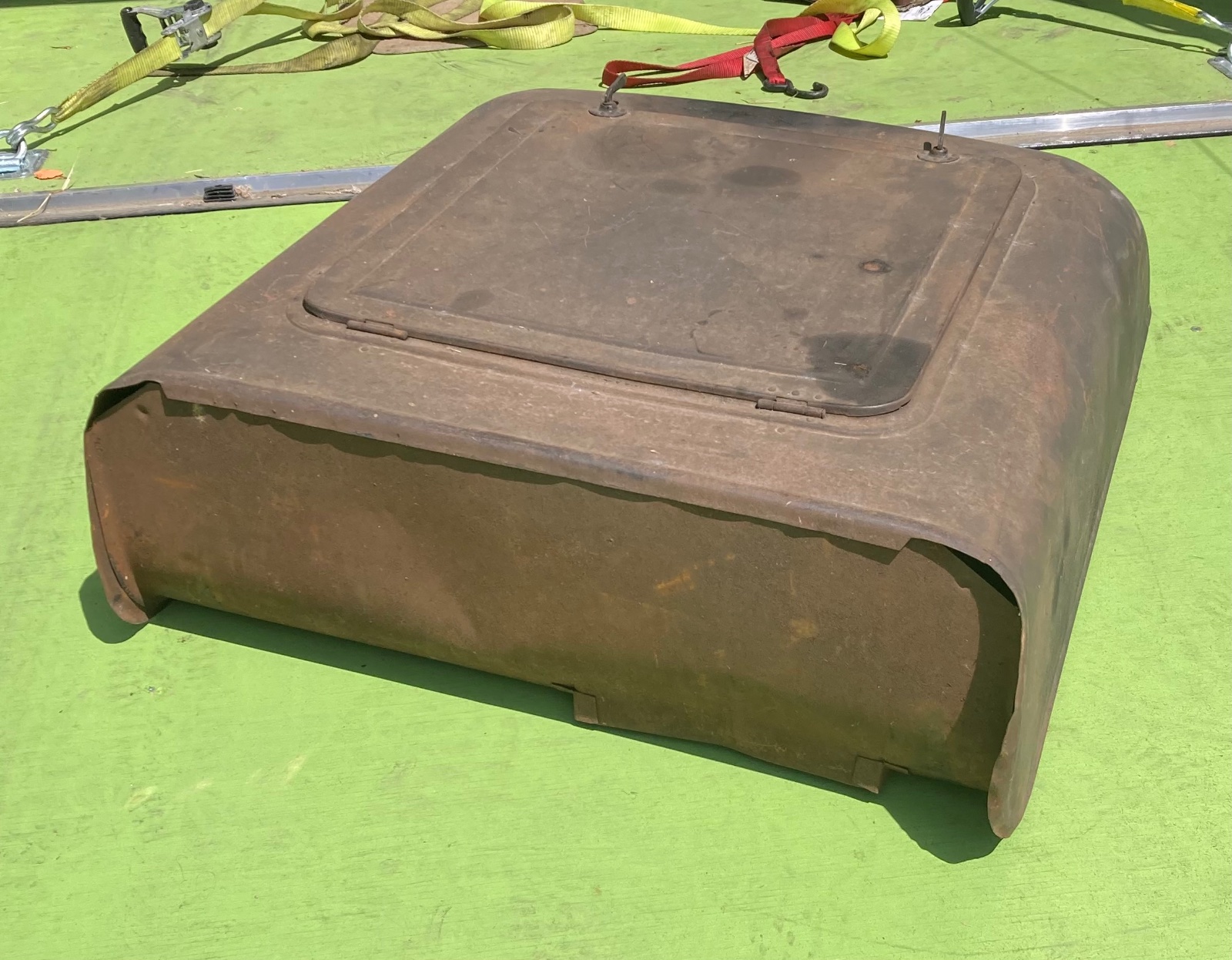 … or replace the pressed steel latches with repro cast latches and take it back to 1914 ! See the sheet metal indent for wet cell battery. Still has some original paint and wood frame. See 2 small somewhat repaired holes on bottom right side toward rear. Otherwise stout sheetmetal and excellent lid, local pickup only. Only $350