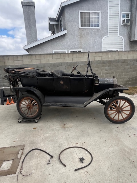 Original unrestored car, original top and upholstery, and paint. The fenders have been repainted. Safety glass in windshield and four new tires and tubes. Car runs, but haven't driven in for several years. There is no wear anywhere. It has a Stewart 100 speedometer, but is not connected. The starting crank and handle have no wear, and is a late 1913 build date. Engine number 378658, cast 10-13-13. Has 1913 hubcaps all around. The wheels have been scraped to the wood. $17,000.