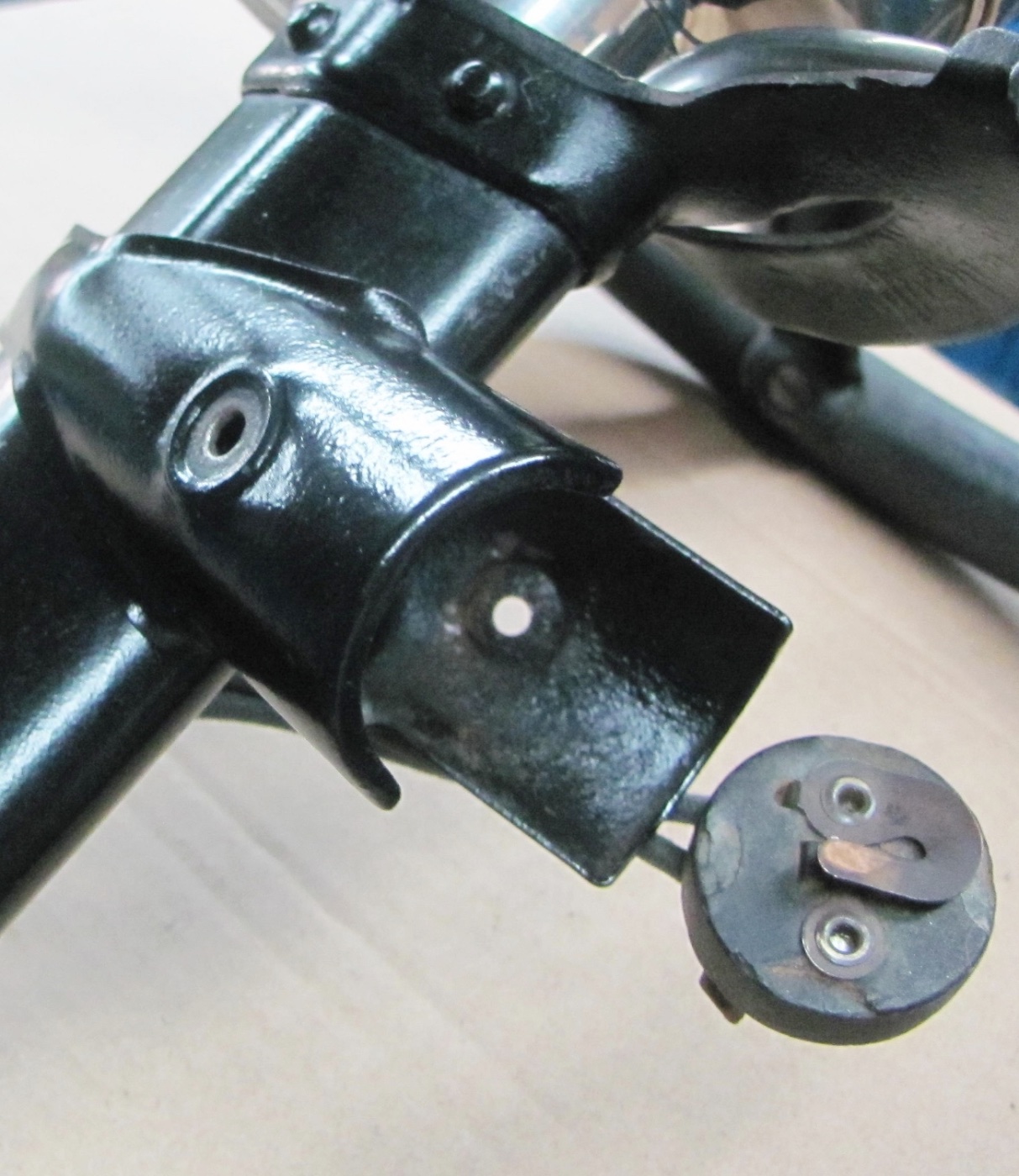 A tiny drift pin helps align the two lugs on the underside of the Bakelite contact part to pass the bolt thru, as you hold the bracket and button in place.