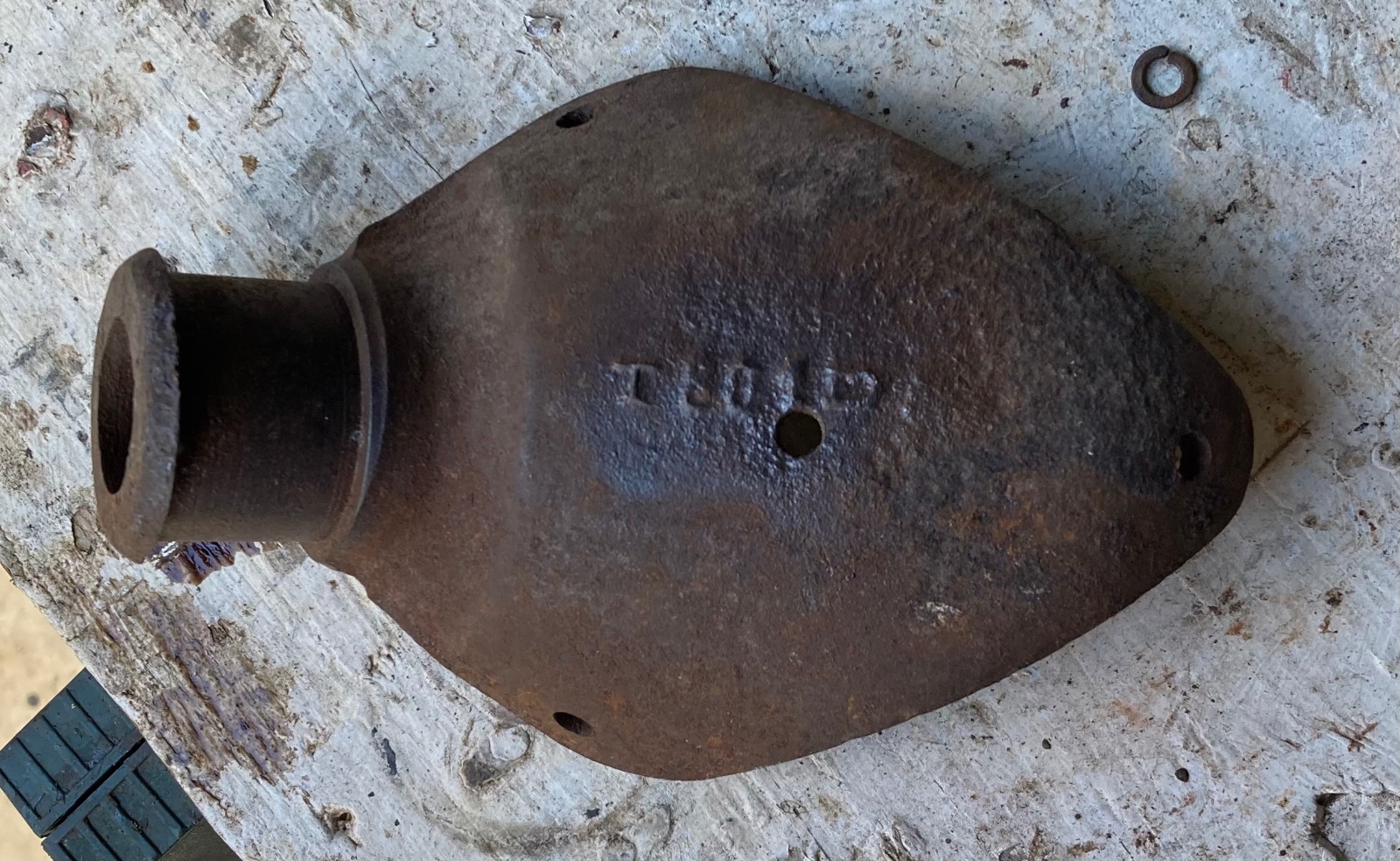 Probably of the 20’s to end of production. Cast iron and can see no evidence of ever being riveted or ever having crank bushing… NOS ?…light superficial rust. Can send to Mark Chaffin for sandblasting. No pitting.