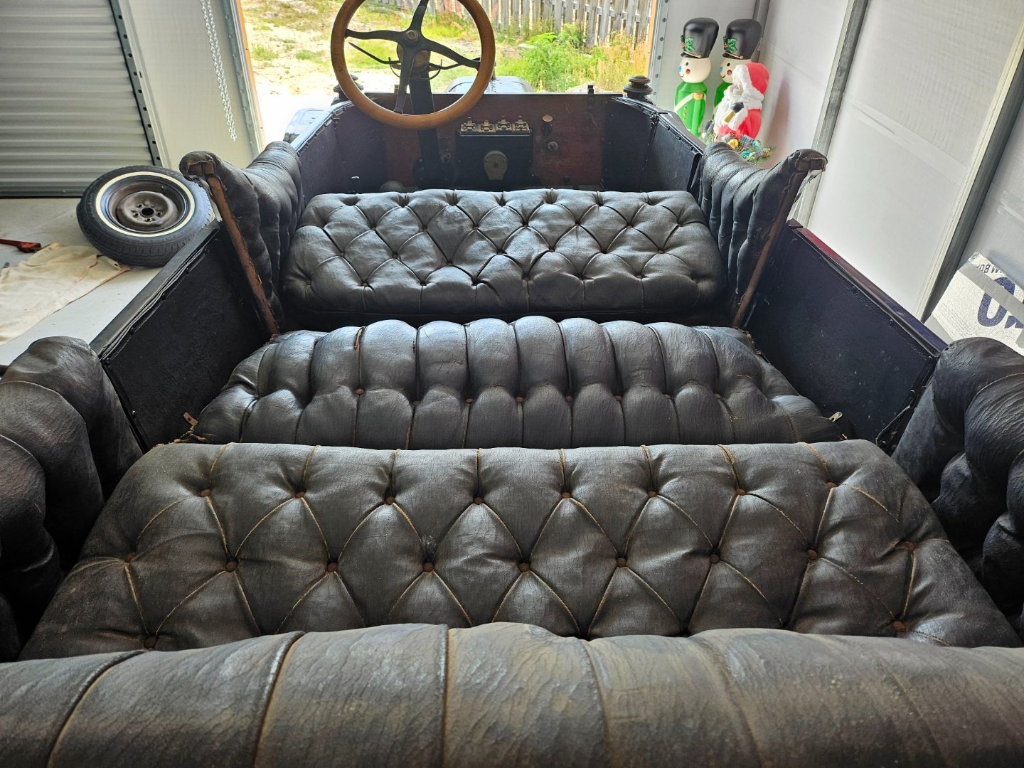 To recline, you simply remove the outer facing attachment screw on the upper tabs to release. On the rear, there was a bracket attached to the body along the door where you re-screwed the upper seat brackets to hold it in place. In these pics you can see where they were placed...but...no longer attached. The guy I bought it from said they were simply wood blocks screwed into the frame, but his Dad removed/never replaced when he started the restoration in the 60's. The door panels were replaced, but everything else is original.
