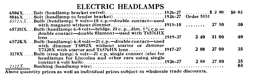 All the bulbs are NOS & have dual tee-pee shaped filaments at equal heights as original. They are 6-8 volts and 21-21 c.p. & fit a headlight base socket. Boxes 1, 2 and 3 each have 10 bulbs with silver color base. Box 4 has 10 bulbs with brass color base over steel. Box 5 just 3 or 4 brass / steel base bulbs and box). I tested all the bulbs for proper continuity so they can be used. The c.p. isn't really bright enough for night time driving but could be good for a brake/tail light with appropriate socket & wiring. They make a nice display item.