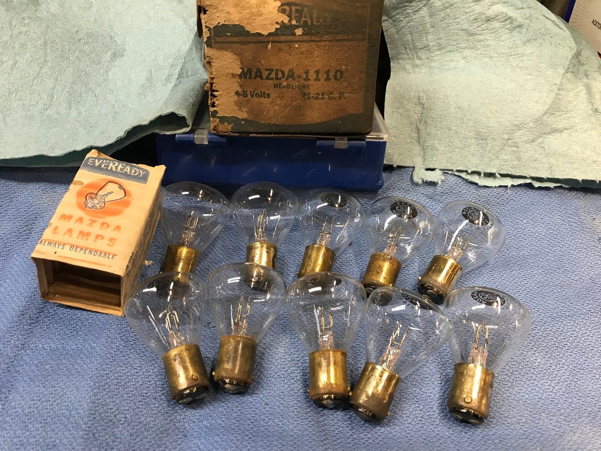 All the bulbs are NOS & have dual tee-pee shaped filaments at equal heights as original. They are 6-8 volts and 21-21 c.p. & fit a headlight base socket. Boxes 1, 2 and 3 each have 10 bulbs with silver color base. Box 4 has 10 bulbs with brass color base over steel. Box 5 just 3 or 4 brass / steel base bulbs and box). I tested all the bulbs for proper continuity so they can be used. The c.p. isn't really bright enough for night time driving but could be good for a brake/tail light with appropriate socket & wiring. They make a nice display item.