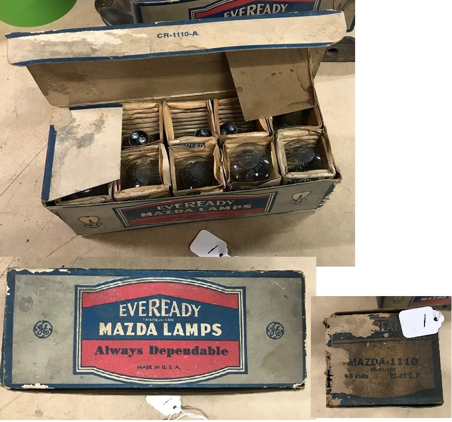 All the bulbs are NOS & have dual tee-pee shaped filaments at equal heights as original. They are 6-8 volts and 21-21 c.p. & fit a headlight base socket. Boxes 1, 2 and 3 each have 10 bulbs with silver color base. Box 4 has 10 bulbs with brass color base over steel. Box 5 just 3 or 4 brass / steel base bulbs and box). I tested all the bulbs for proper continuity so they can be used. The c.p. isn't really bright enough for night time driving but could be good for a brake/tail light with appropriate socket & wiring. They make a nice display item.