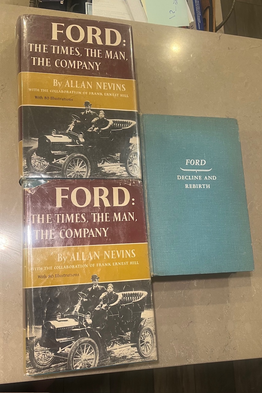 I have two copies of Ford the times the man, the company by Alan Nevins, and one copy of Ford decline and rebirth by Alan Nevins. The Times, the man the company is the history of Ford from 1903 to the end of model T production and is the best Ford history book I have ever read, excellent research. Decline and rebirth is about Ford history from 1933 to 1962 and is an excellent book on Ford history of that period. $75.00 each plus shipping. kdmks AT att.net.