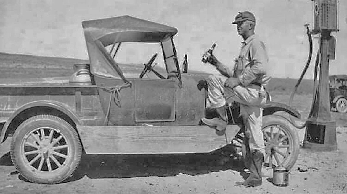 The 3rd photo from the top: Man standing beside ‘26 RPU - drinking a beer next to a cool ‘Mae West’ gas pump…I’ve previously seen this horrid method of expanding carrying capacity in another of Tom’s photos…I first considered he was resting his booted foot on a Splash Apron but further examination revealed whats probably a 1X12 cut on the curve of front and rear fenders and bolted to same !!!