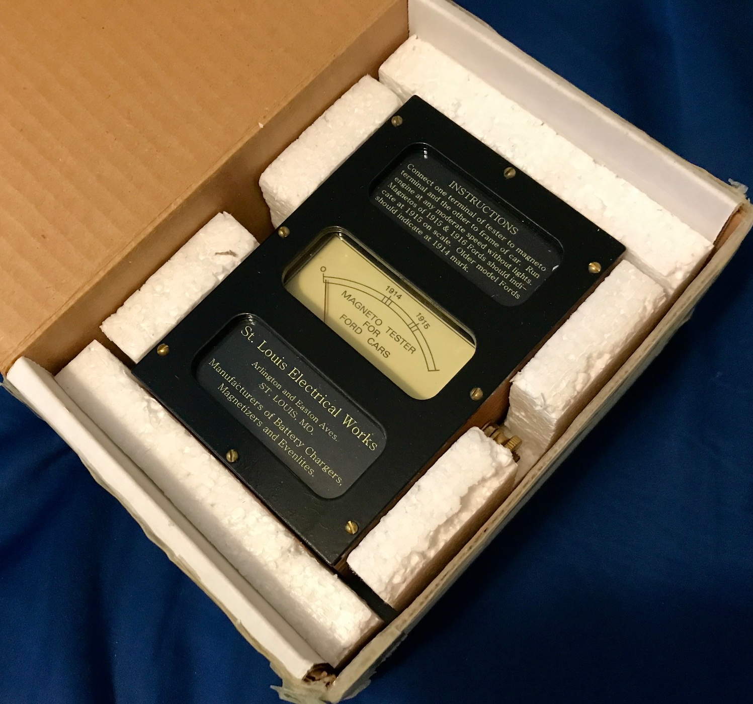 New, never used, still in the box, reproduction St. Louis Magneto Tester. Beautiful exact copy of a hard to find tool, exceptional woodwork, incredible reproduction. Includes directions/instructions. A must have tool for display or actual use. 375 includes shipping.
