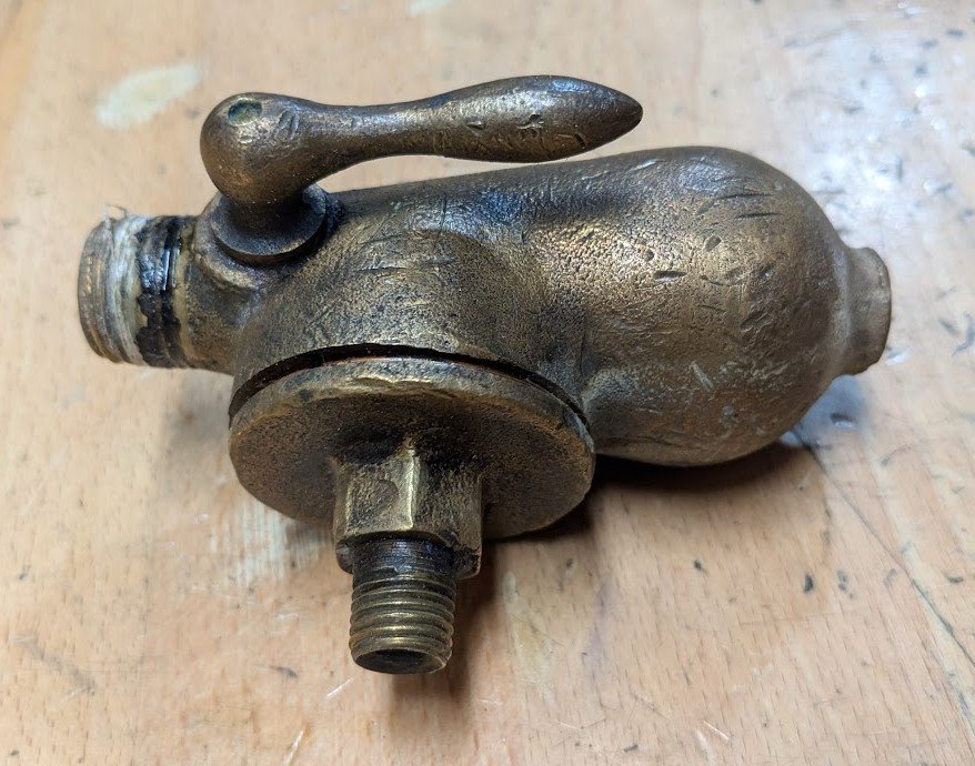 Early brass Ford script sediment bowl. The shut off/on handle works fine. $90.00