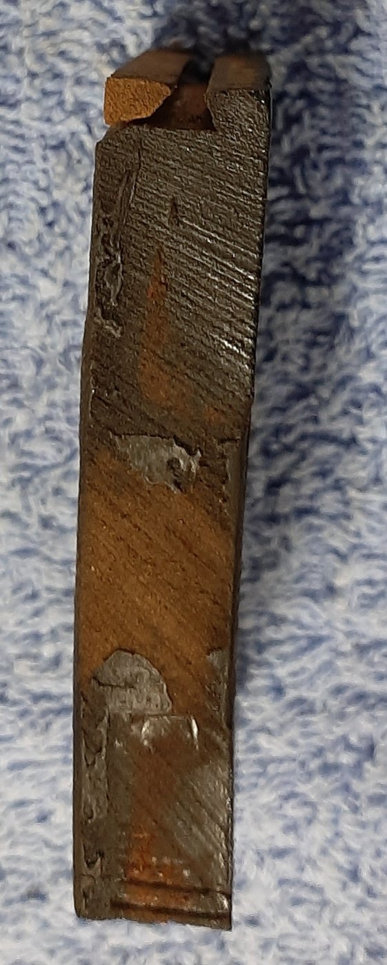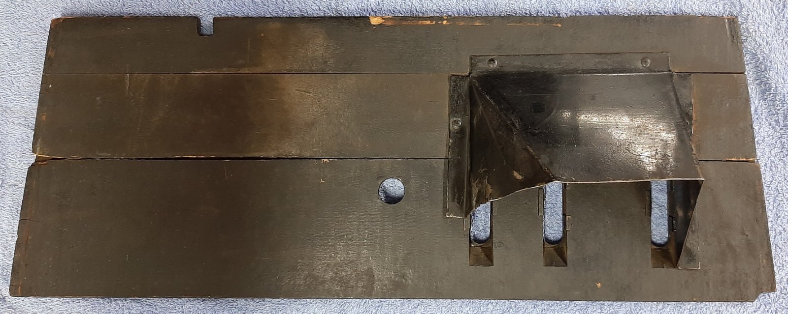After some inspection I was surprised to find that the upper board (nº 1) is made from not 1 piece but 5 pieces of wood which are dovetailed and the riveted metal pedal slots hold them together. This shows the 4 pieces which are dovetailed to the upper piece.