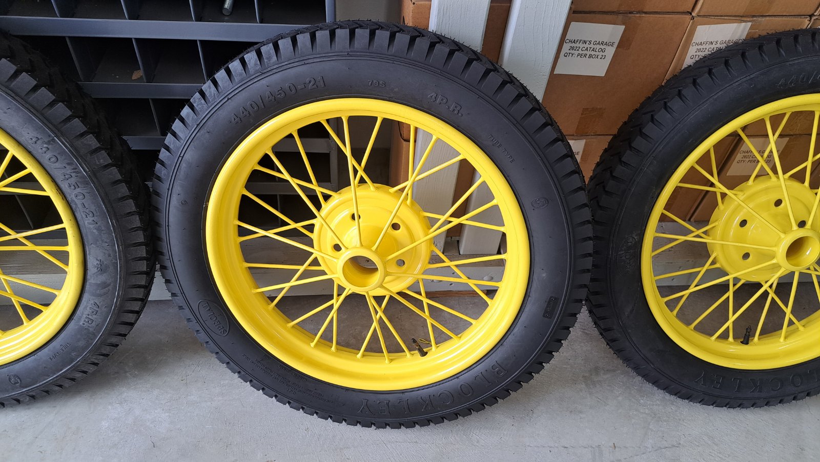 I'm currently swapping out wood wheels for wires, I have older Firestones on now 440/450X21. Was considering demounting them and putting on the wires. the tread depth is from 6-4/32. But also may go new, are the Lucas tires any good, has anyone an experience with them . They sell for $149.95 @ Snyders, which is about half of Firestone. We drive paved roads with a bit of gravel thrown in. I would like an opinion , thanks. By the way the woods, rims, and tires, if I get new, will be for sale. Wingnut