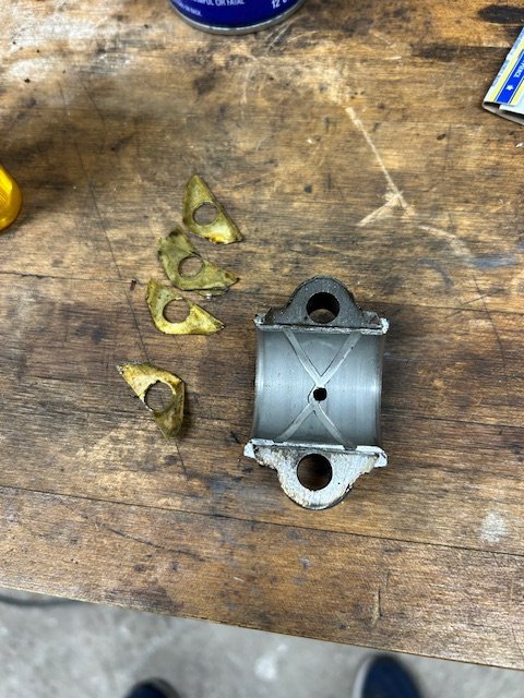 I should have clarified this. Each side of the rod cap was shimmed .054". Since I'm using the shims from Snyder's that are .035" (I think), I have to use part of 2 shim packs on each side of the rod cap. So I have 2 shim packs laying in the front of the pan down towards some sort of riveted plate by the drain.