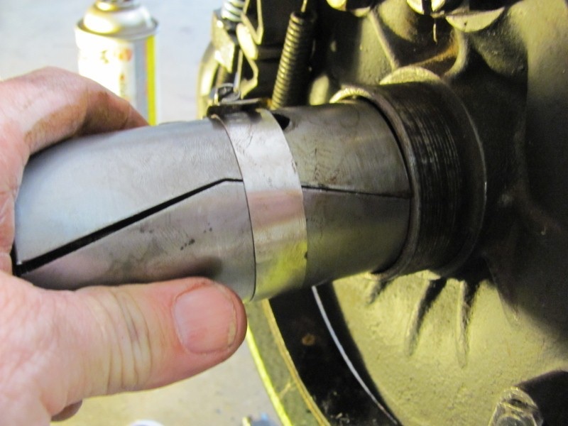 Then place a radiator gear drive hose clamp around the sleeve to collapse it some for slipping it in , align the bump on the sleeve to the recess in the housing