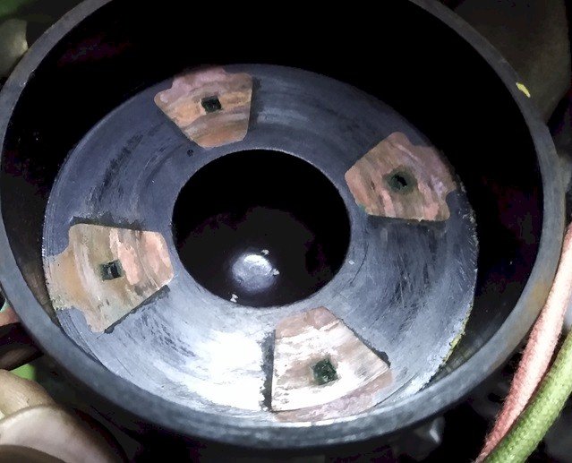 Check the timer rotor. Here is the brush. It wobbled back and forth. I squeezed the sides to remove play and it's three times better. The switch can lose continuity. When I found problems using the VOM, the switch was out of the equation as it was OFF and I was bypassing all use of 6v by testing only the ground side. Ground to rotor to contact surface to wire terminals at the coil box. But, if Vern honestly doesn't know what "new" is, I'm certainly willing to cycle and clean it.