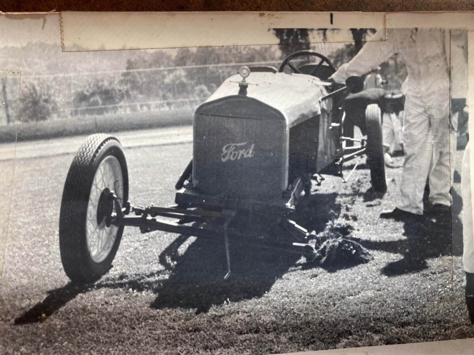 I don't recall what specific race it was. How many laps etcetera, however, a few laps into the race I was heading into the second turn while paying attention to the faster cars coming up behind me! I staked my claim about the middle of the track as a couple of the faster cars were pushing to the inside to pass me, while another red car had begun coming up on my outside. And into the turn we headed, the entire cluster of cars, me being passed on both sides! Dexter Clary and son went around on my right side and I slacked off on my speed slightly to give them more room. Meanwhile, on my left, a much faster car went by leaving me behind and beginning to pass the Clary's red car ahead of me. Just at that moment, maybe fifty feet ahead of me, it happened! The rear hub of the faster car, which was holding the wire wheel in place, broke! I saw the wheel come off, the rear end dropping one side into the dirt with dust flying ahead of me I quickly shut down my throttle and began steering off to the outside of the track.
