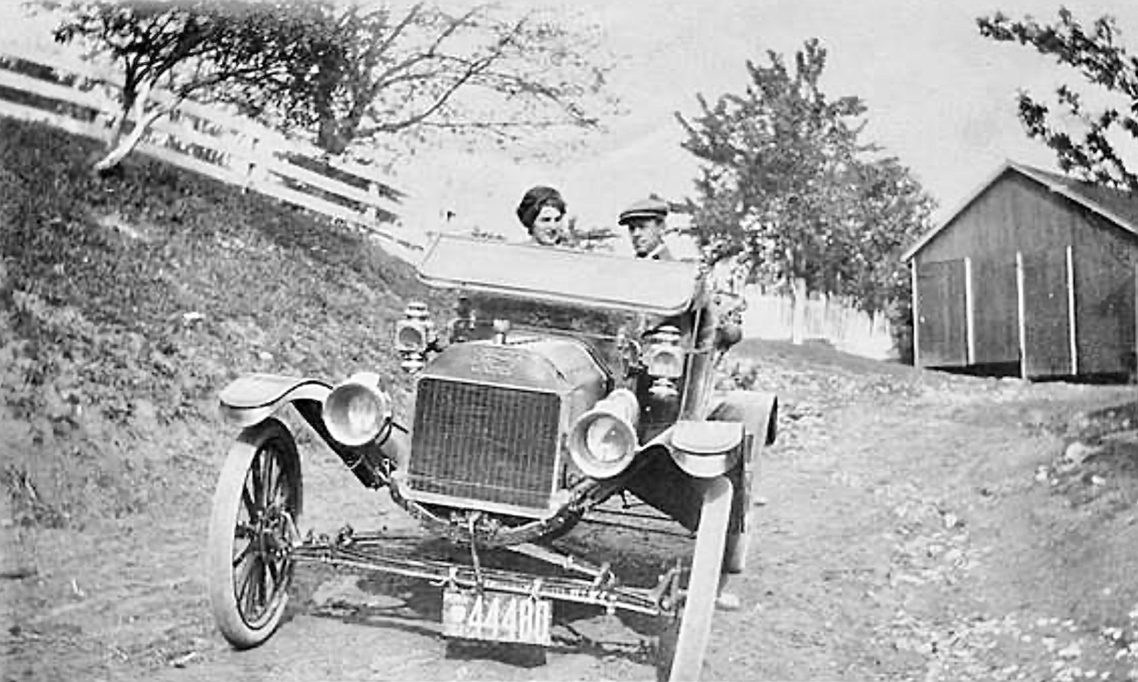 The car appears to be a 1915 or 1916 with later front fenders, and well used. The clothing styles are unusual, and appear to be much later than 1916. The one fellow might be wearing a swim suit with some unusual sort of pants.