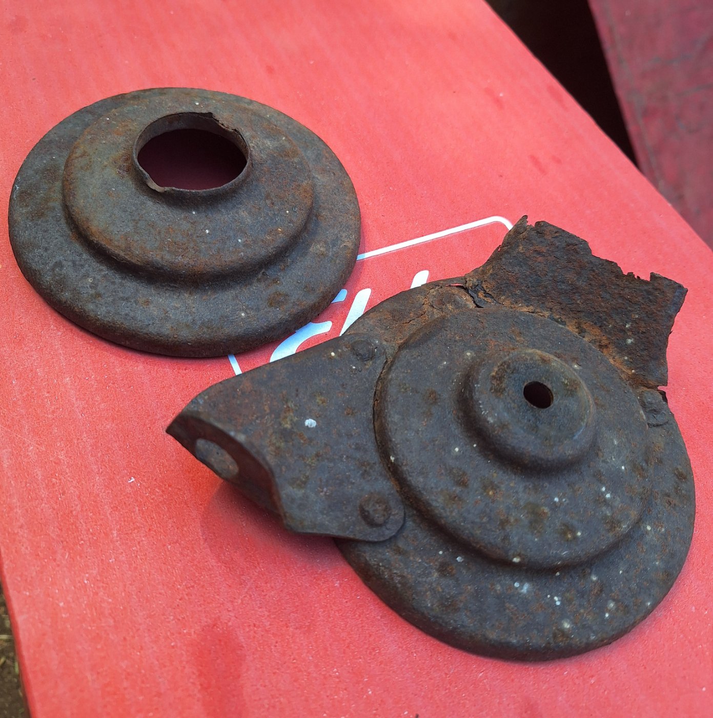 Notice the riveted on bracket and separate deflector. Like US production, the ends appear to be pressed with two thicknesses of thinner material. On the front end there is a lair of crescent shaped cut-outs on the small lip that goes to the exhaust pipe. Instead of the rolled in Ridge used on the US exhaust pipes, up to which the muffler end is jammed, the Canadians drilled the pipe and installed a 1/4" cotter pin as a register for the front end cover