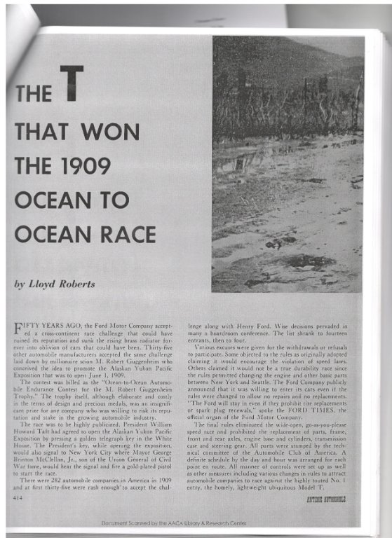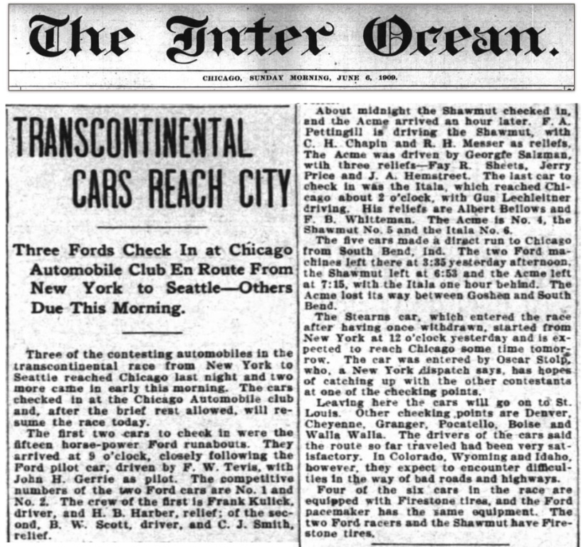 In the course of research, I've gathered up as many 1909 news clips as I could find (from hundreds of local and national newspapers, trade publications, and other sources) and tracked down more than 50 descendants of people involved in the race in one fashion or another, including relatives from all six crews (the two Fords, the Shawmut, the Acme, the Itala ... and the Stearns, which started late and only got as far as Tarrytown, NY) and several of Ford's corporate branch managers, who served as "fixers" in every sense of the word (arranging to have dealers and agents in their territory serve as expert local guides for the Model Ts, publicizing the Ford entries to the local press, and engaging in tactics that the Ford team deemed savvy "generalship," though the ACA officials who ruled in favor of Shawmut's appeal would later take a dimmer view).