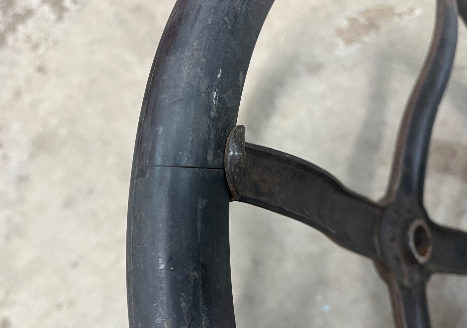 It’s in usable shape and has one crack about 1” long like a lot of these old wheels have as shown in the pictures.