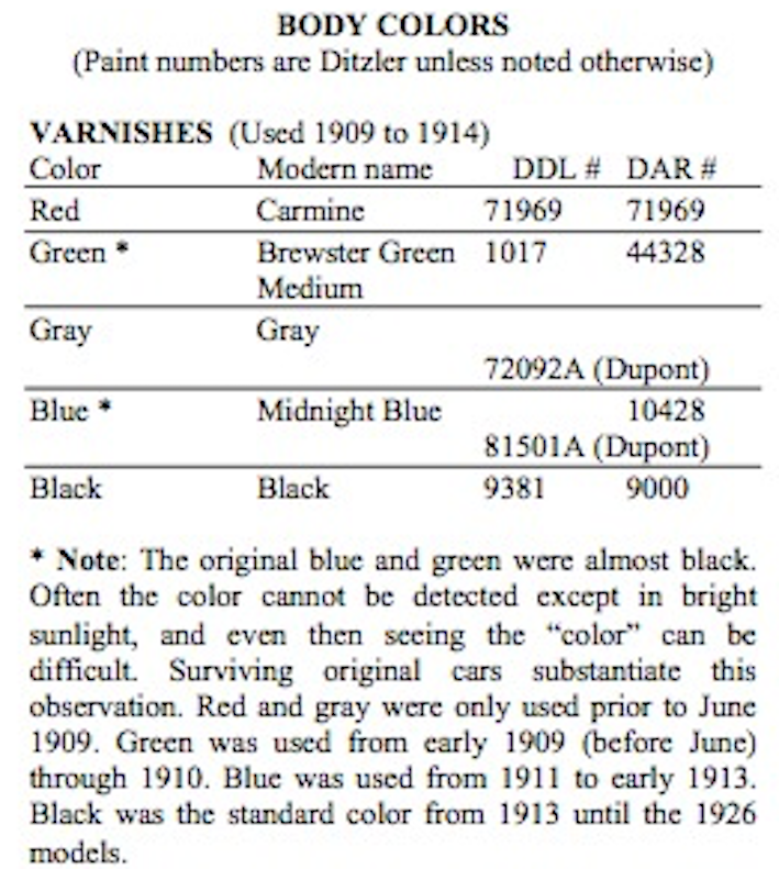 Whenever this subject comes up I point out that names are not a dependable reference. One company's Kelly green may be another company's Envy green. Specific formulas are better. With modern technology a paint company can also match the original color scanned from an original body part with a spectrometer. This page from McCalley's encyclopedia lists specific formulas.