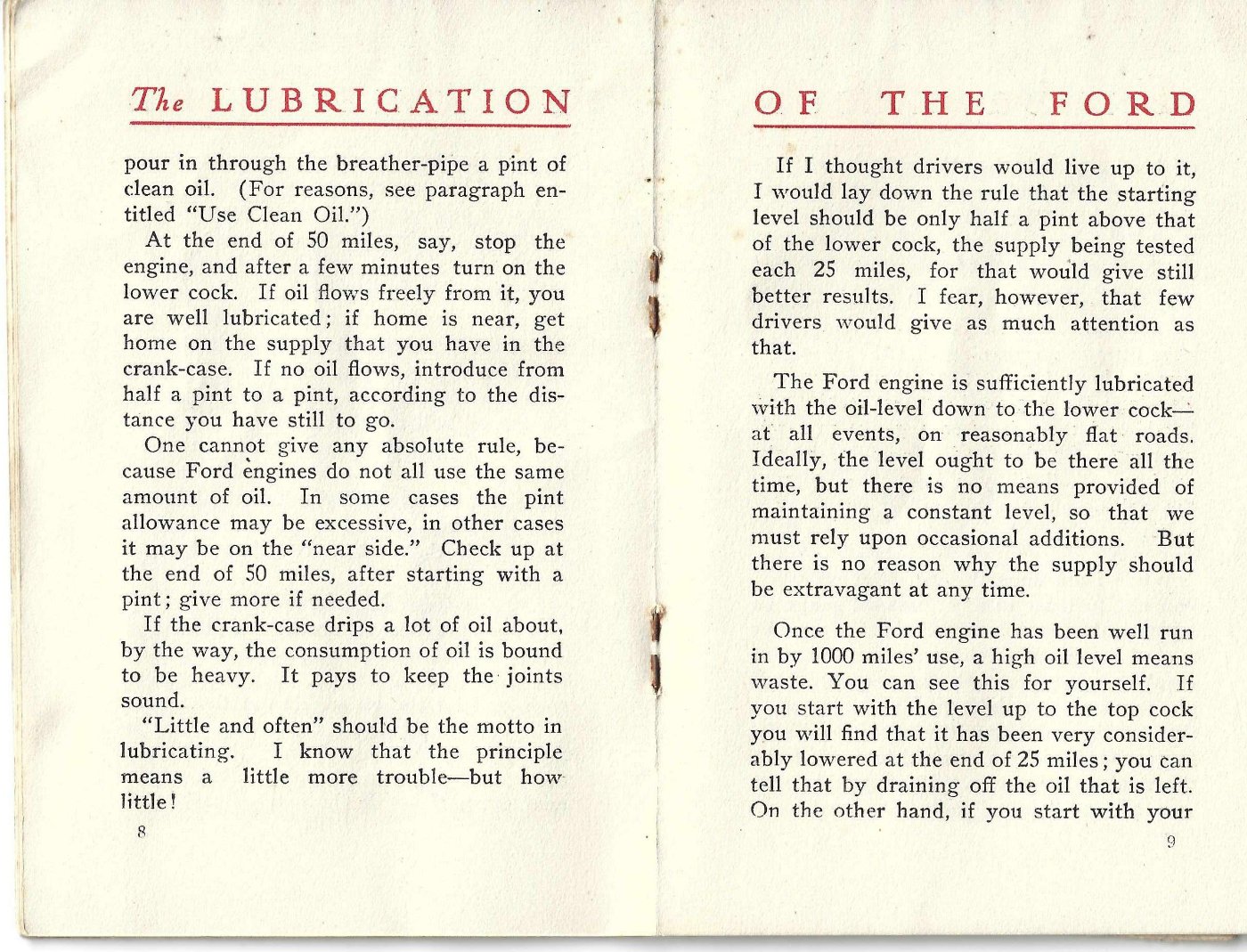 An oil company instructing Model T Ford owners to drain the oil down to the lower petcock and then adding a pint of (I presume) fresh oil is just a ruse to sell more motor oil.