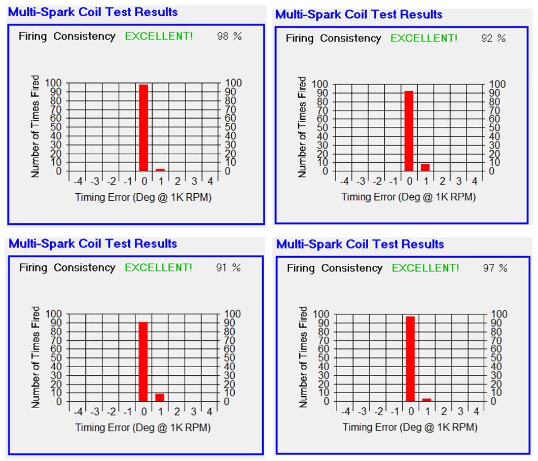 Shown below are typical Multi-Spark firing consistency test results of 4 properly adjusted coils using a ECCT by a typical user. A nice attribute of the ECCT adjusted coils very repeatable results. If your coils test similar to these on the ECCT, they were very likely tuned using a ECCT.